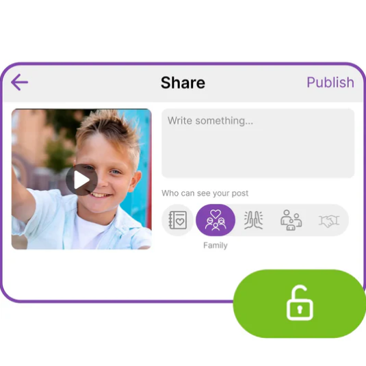 透過 myFirst Circle,家長可決定誰能看到孩子的作品。孩子在兒童友善的社交圈中分享照片,依關係分類(家庭、摯友、朋友、熟人),家長可管理可見度,也能必要時編輯貼文。